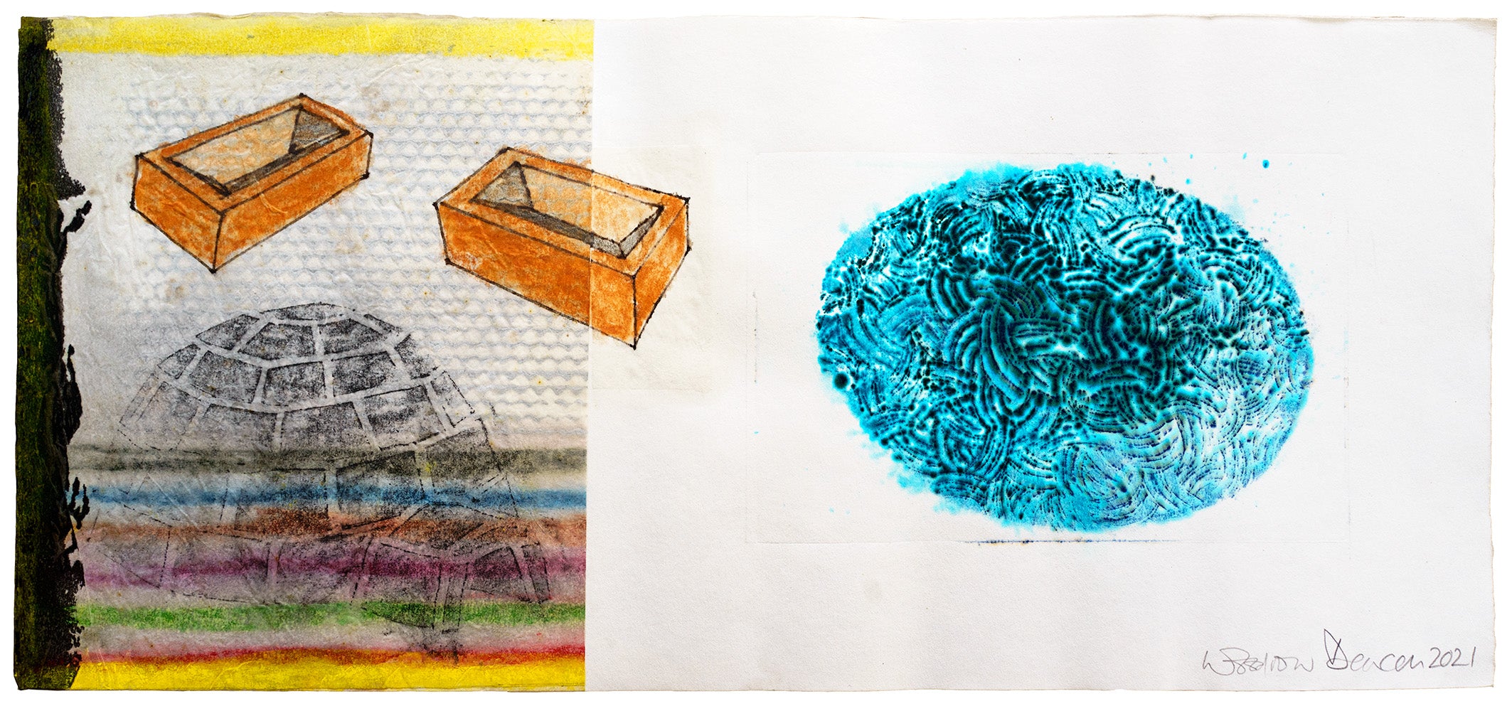 2021Ink, collage, water colour, paper21.5 x 46 cmCollaboration between Bill Woodrow and Richard DeaconOne of a series of 12 hand coloured prints. Each a unique variation.21/24